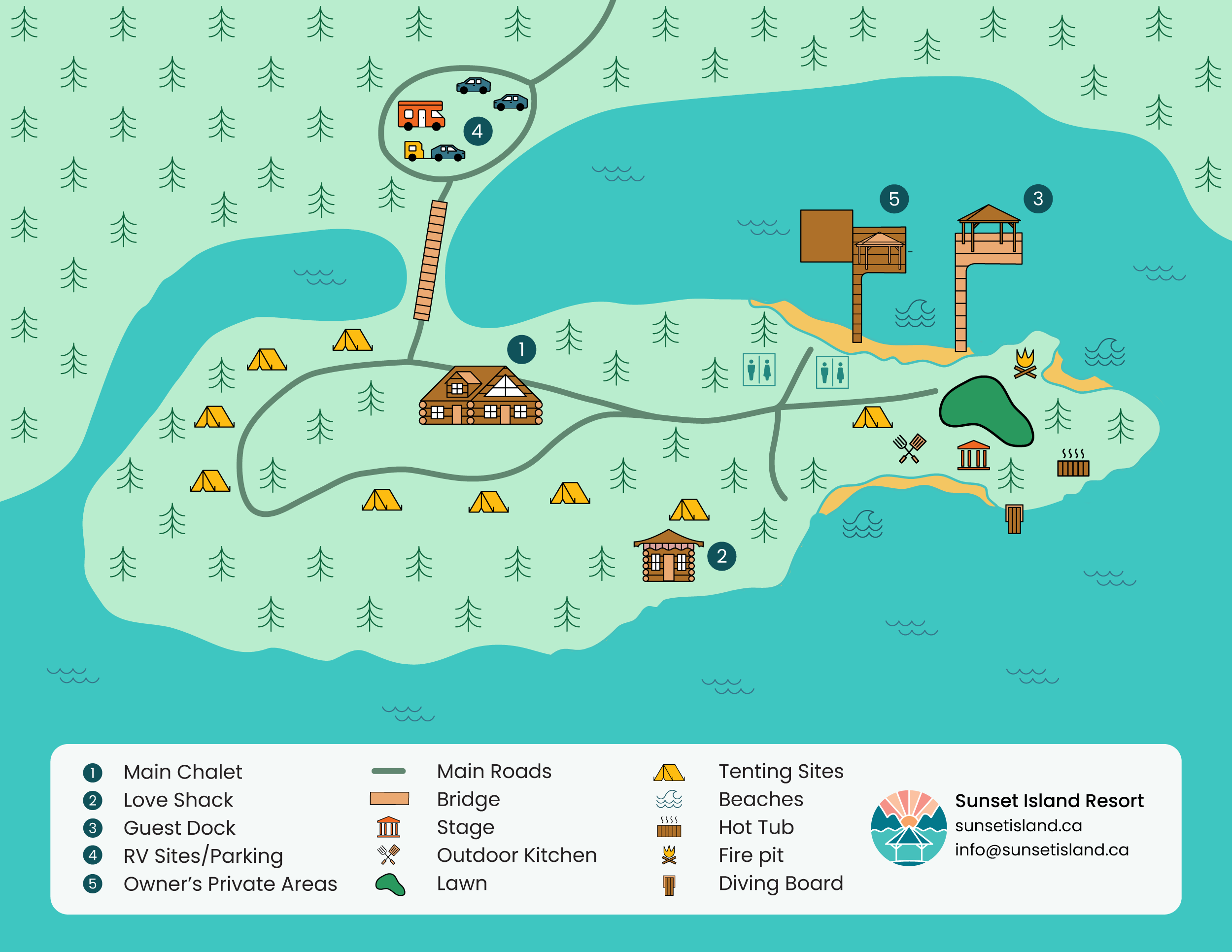 Sunset Island Resort is accessible by vehicle, boat or float plane. Drive straight onto your own private island via a scenic dirt road and private bridge. Vehicles park right on the island, with seamless access to cabins, docks, and event spaces.